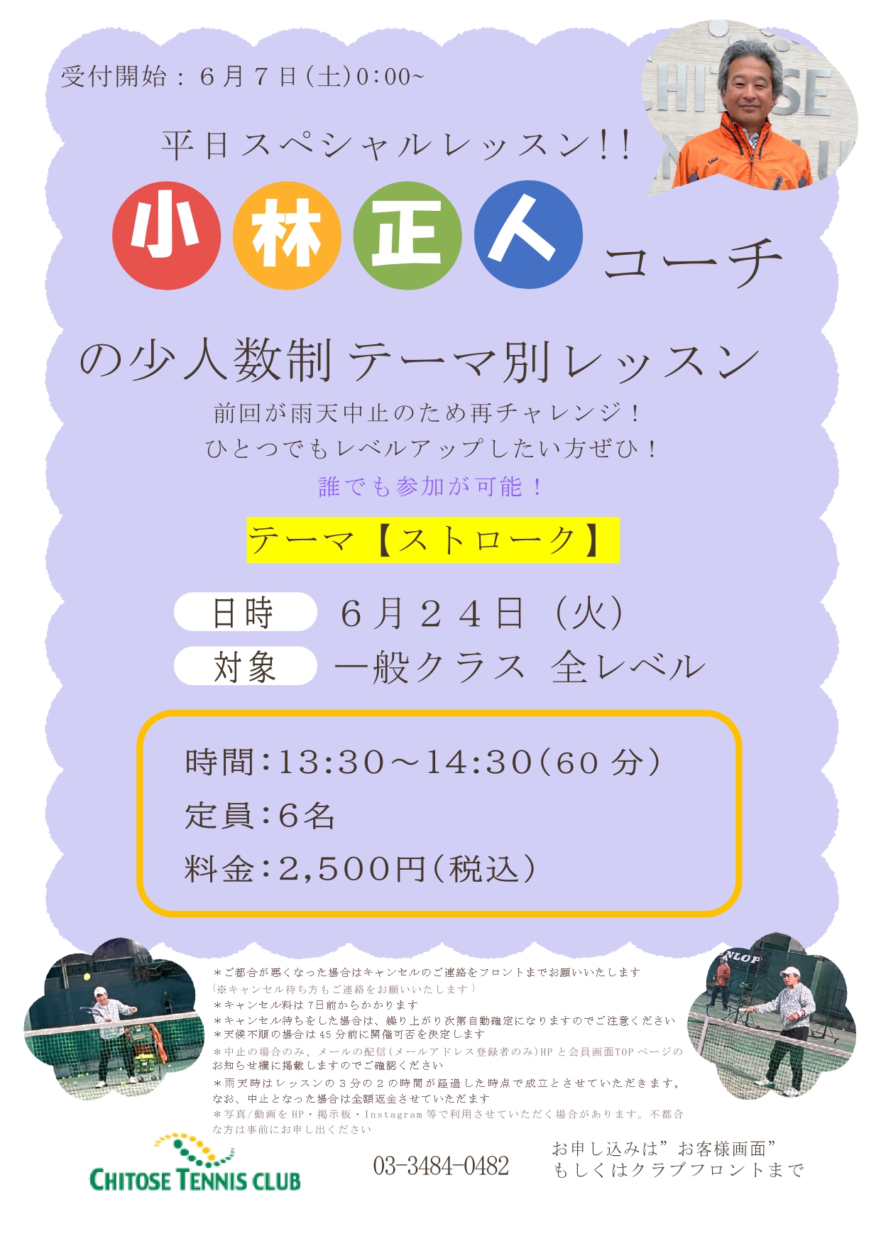 前回、雨天中止となった小林正人コーチの少人数制テーマ別レッスン会をリベンジ開催いたします。ストロークに悩まれている方、レベルアップを目指されている方におすすめ!誰でも参加が可能!少人数制で集中的にショットを学べます。