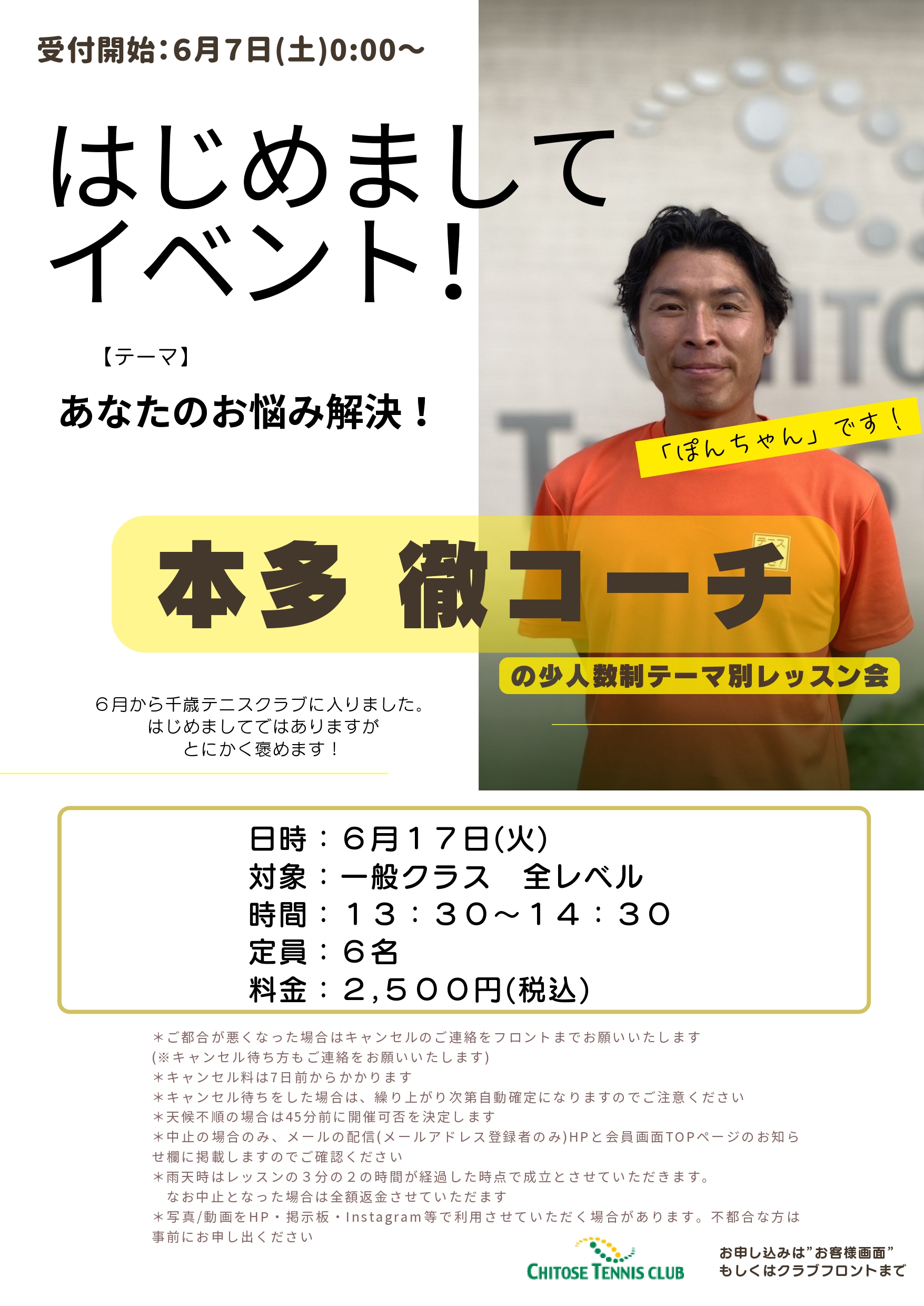 今月より千歳テニスクラブに加わりレッスンを行っている本多徹コーチによる、テーマ別レッスン会開催のご案内です。