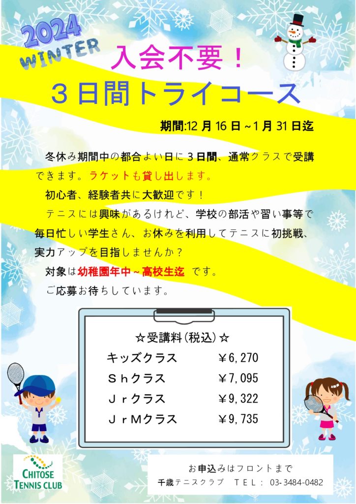 冬休み期間中の都合良い日に3日間、通常クラスで受講することができます。 初心者、経験者ともに大歓迎です!(初心者クラス、経験者クラスに分かれてレッスンを行います。) ご応募お待ちしております!
