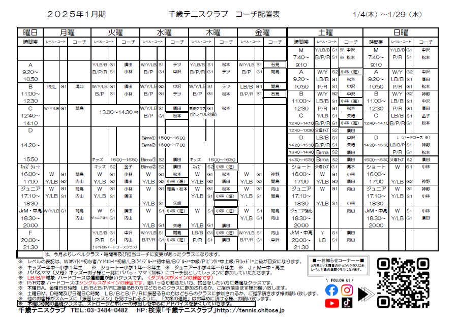 2025年1月 コーチ配置表(千歳TC)