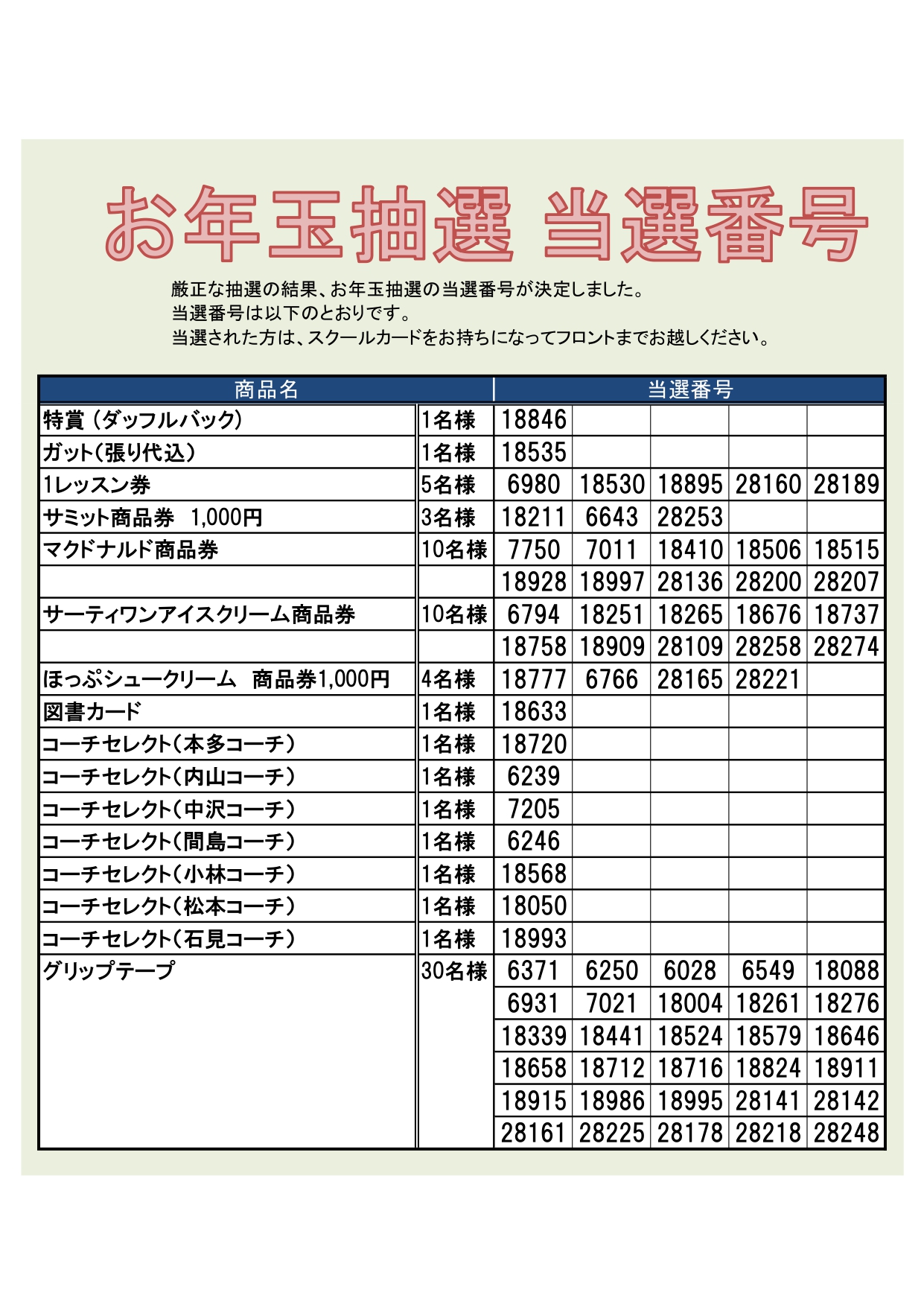 当選景品交換の際は番号を確認致しますので、スクールカードをご持参の上クラブフロントまでお越し下さい。
