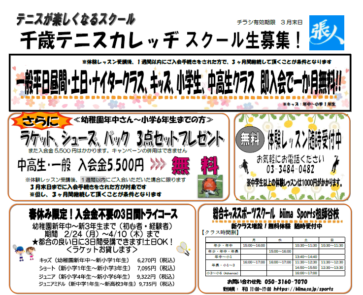 一般平日昼間・土日・ナイタークラス、キッズ、小学生、中高生クラス 即入会で一か月無料
