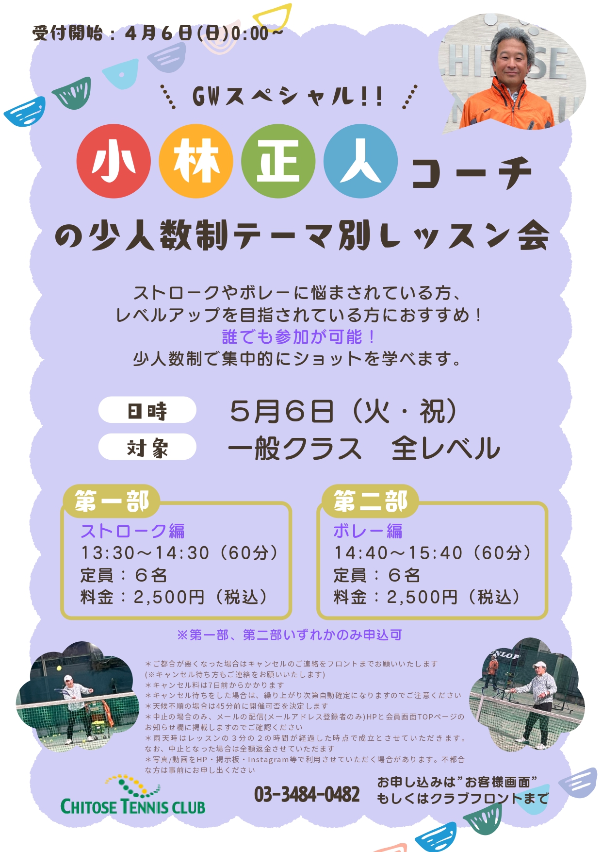 昨年夏に千歳テニスクラブにコーチとして加わった 小林正人コーチによる少人数制テーマ別レッスン会をゴールデンウィークに開催します。
